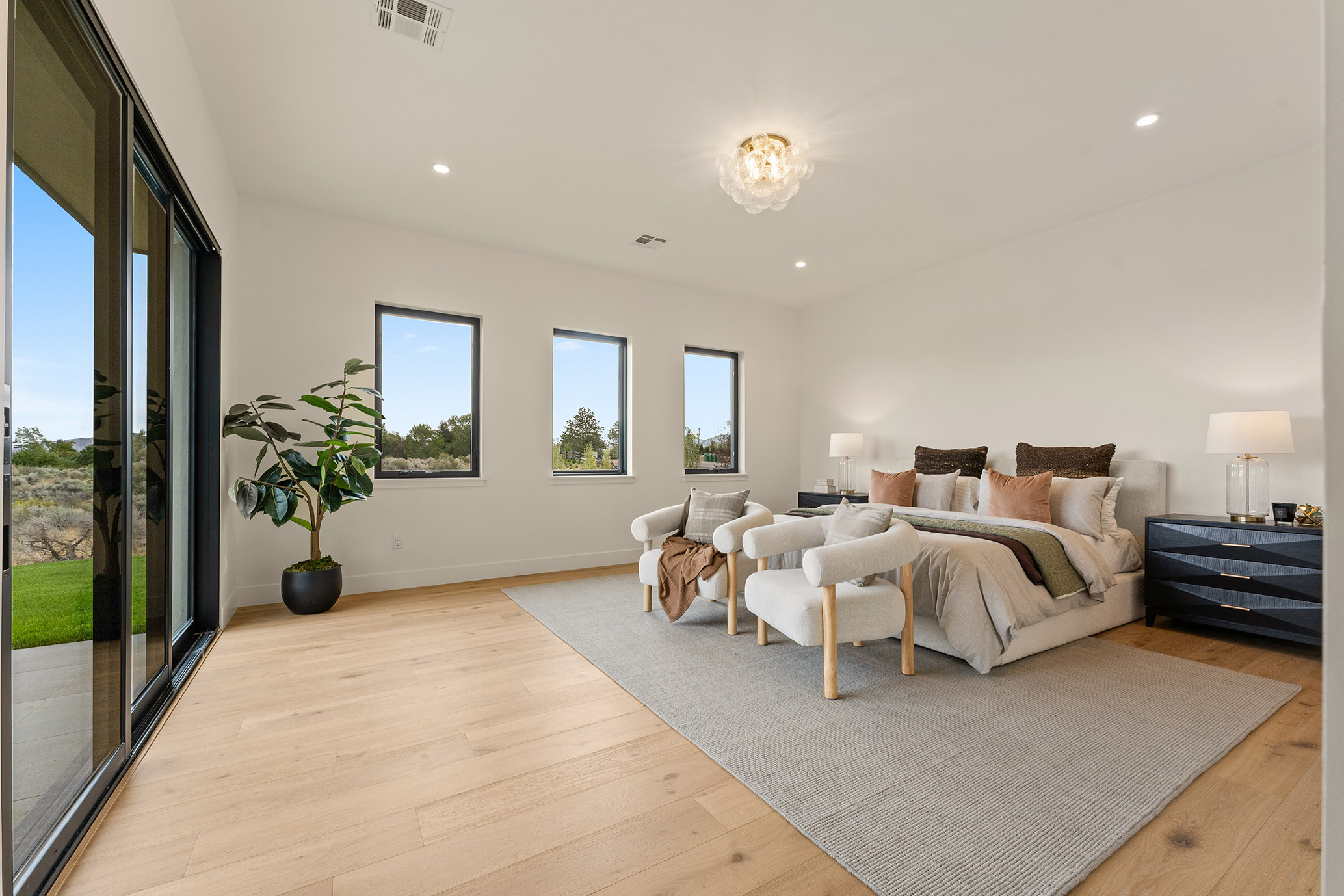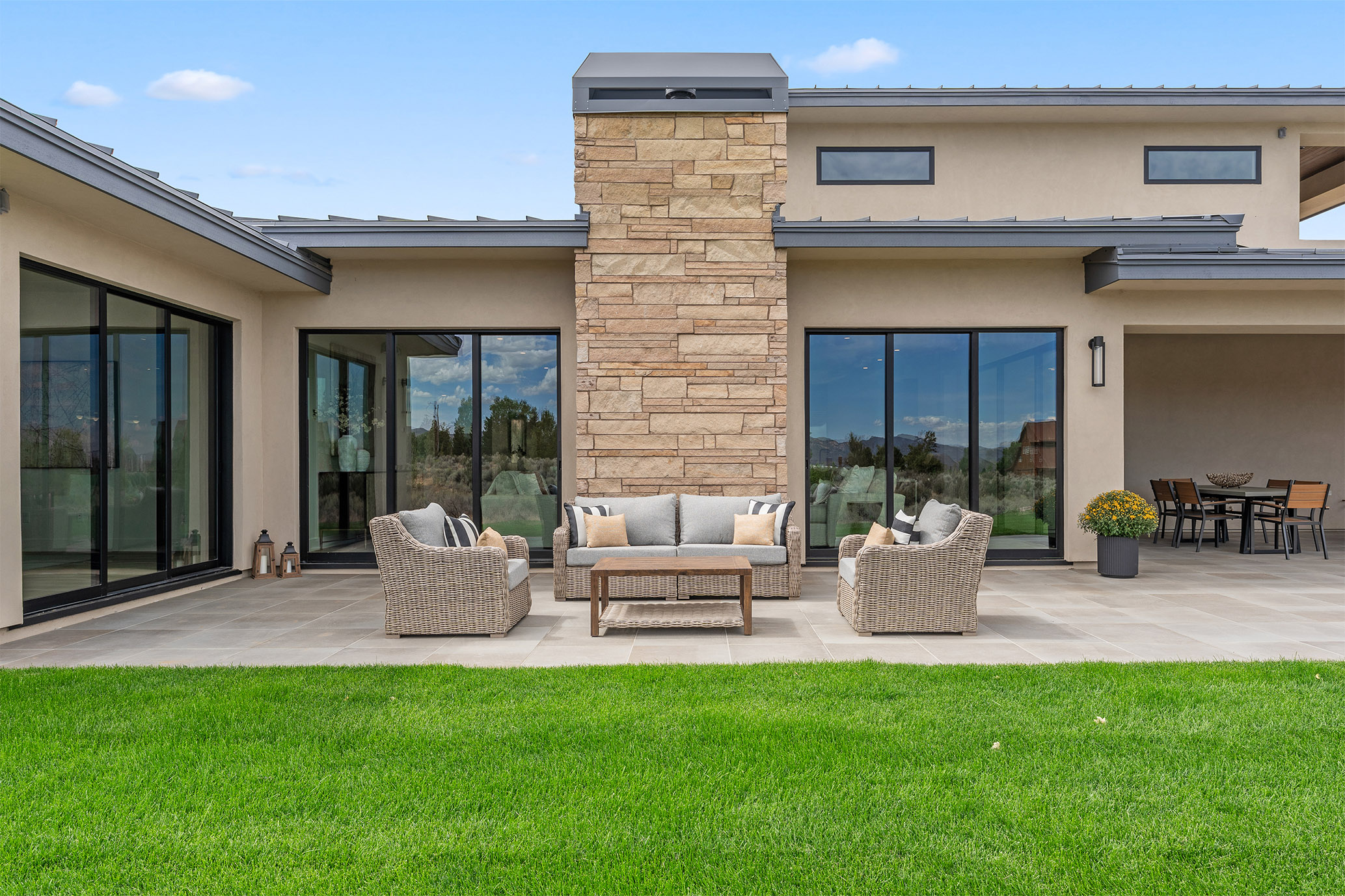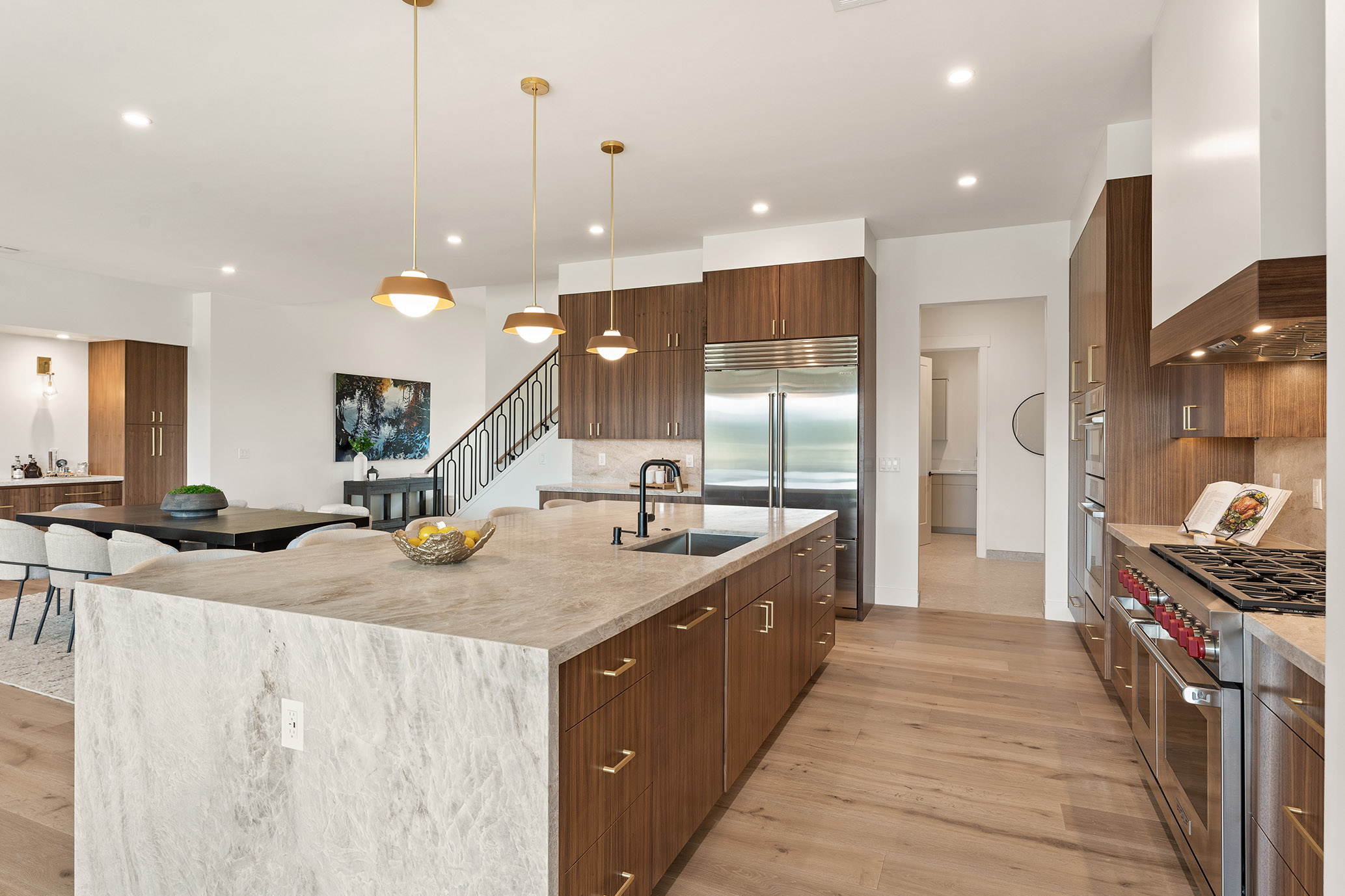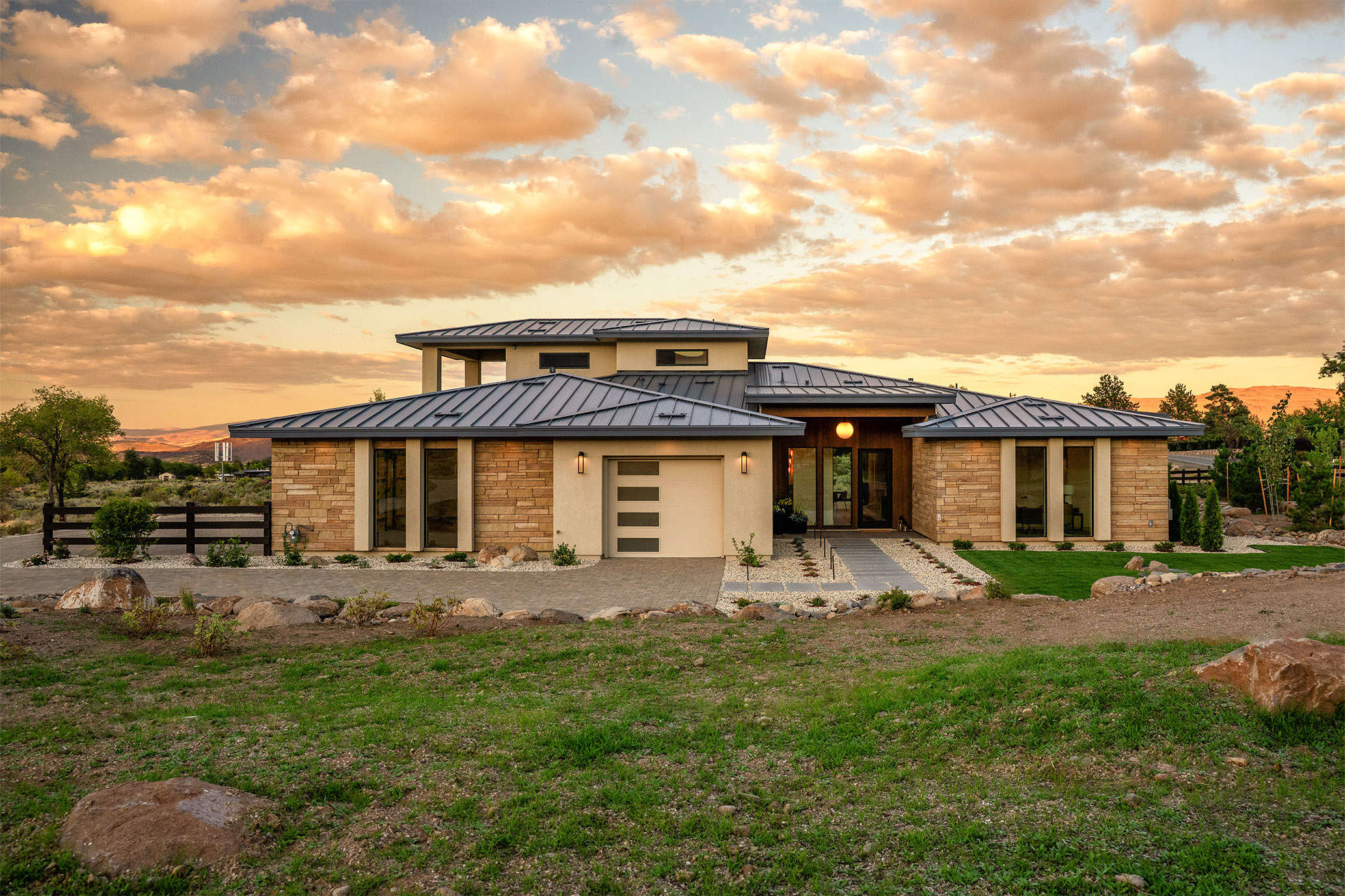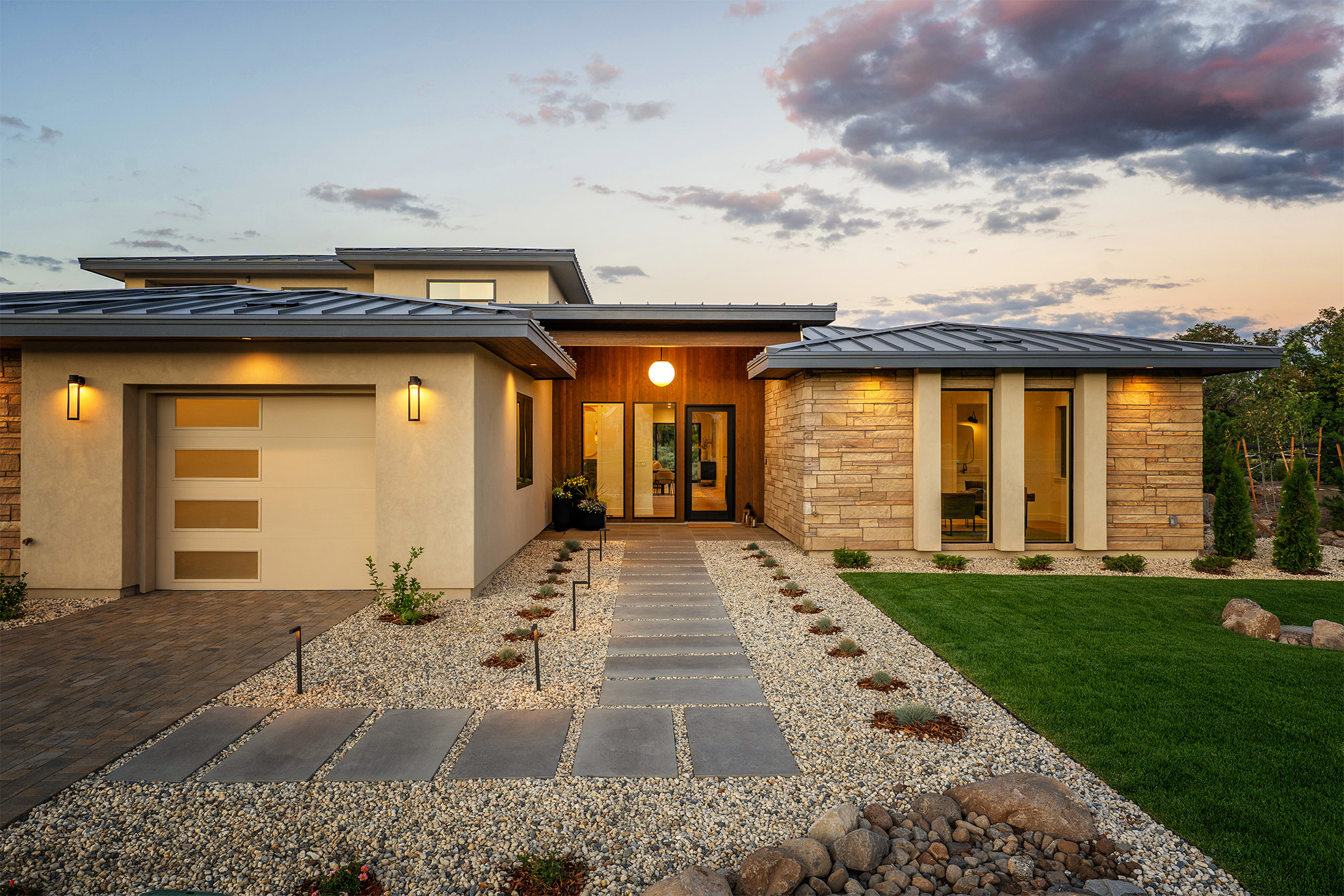Natural sandstone cladding, metal roofing, and cedar accents combine for a striking exterior that sets an upscale tone for this contemporary design. Sunlight pours in through the glass entryway to create an airy and expansive ambiance continued by the white oak flooring and 10-foot ceilings throughout the home.