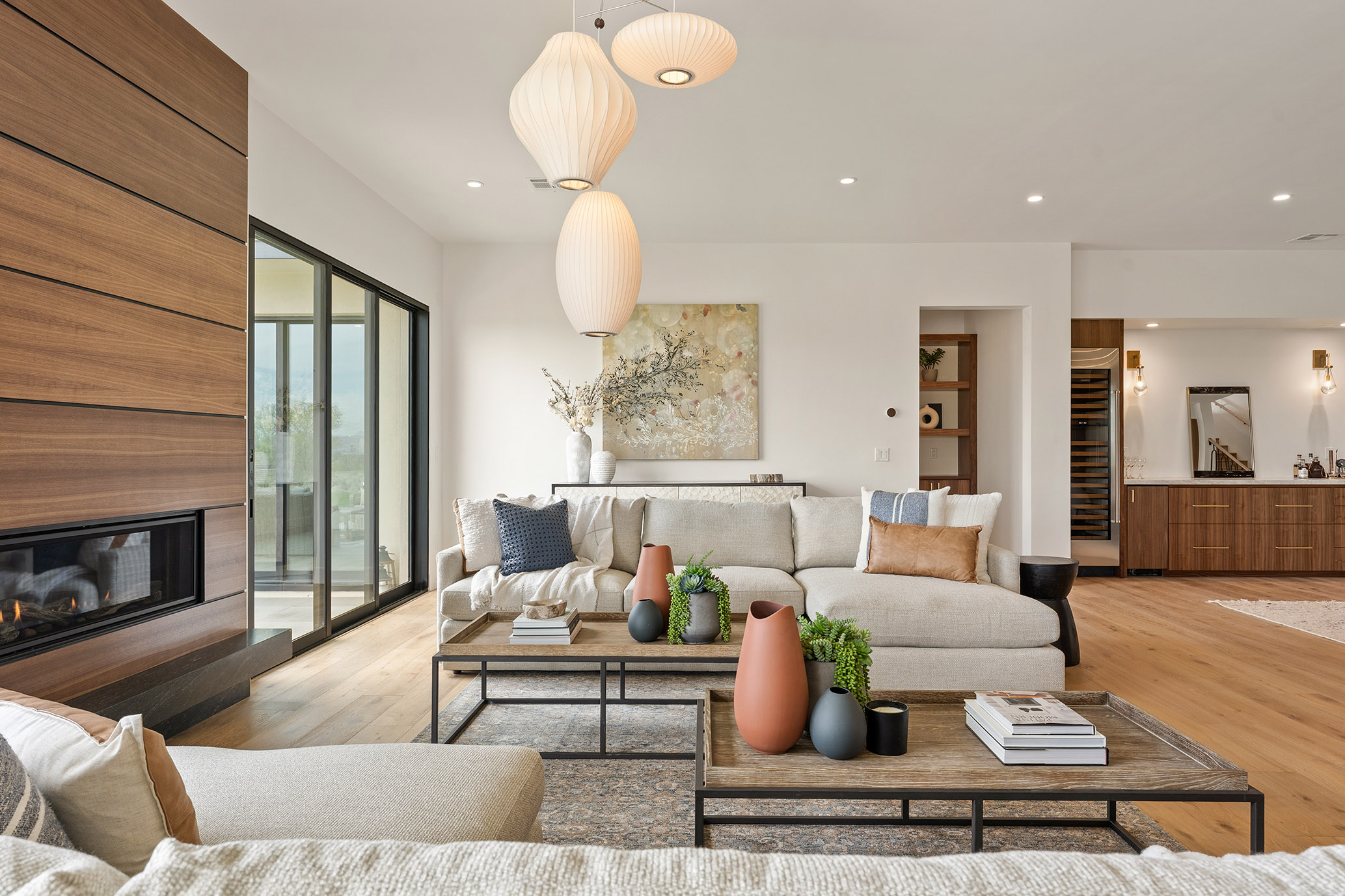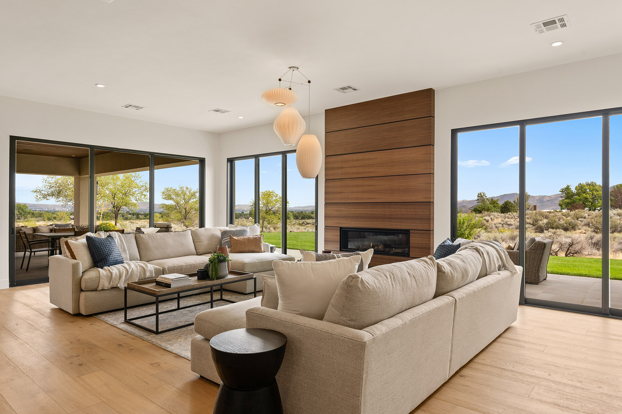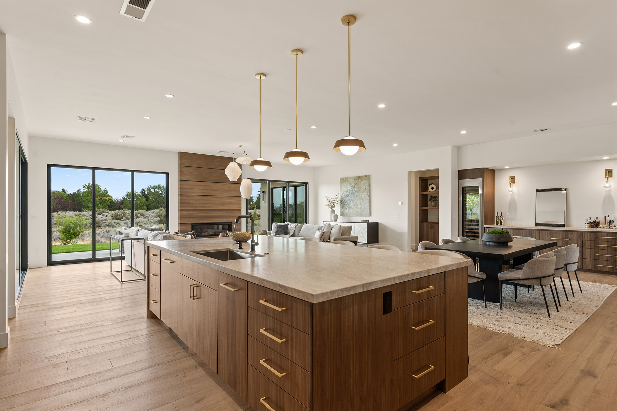 The home is centered around the open living and kitchen area – this is a setting for entertaining on a grand scale – three sets of sliding glass doors open to a large patio for seamless indoor-outdoor flow.