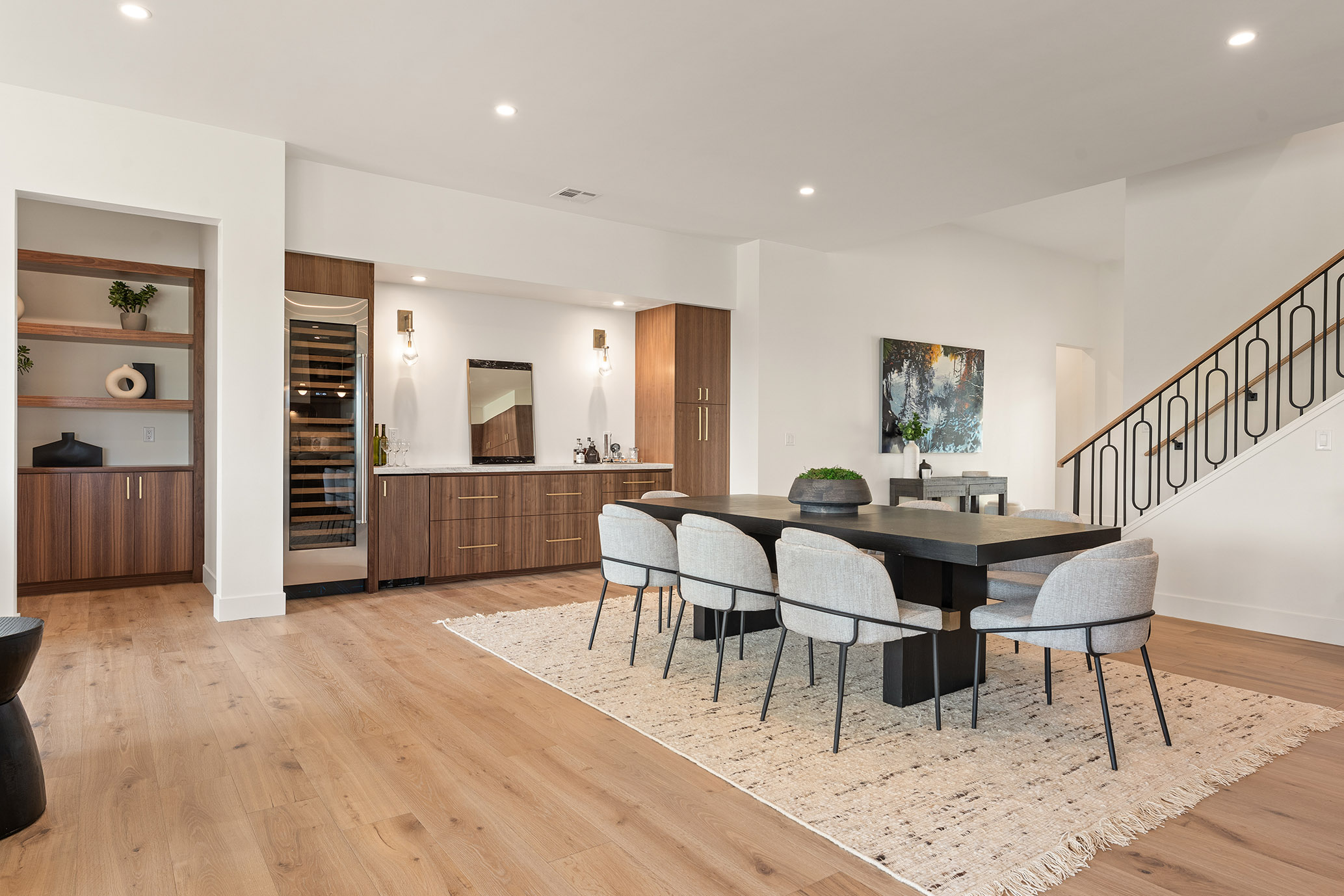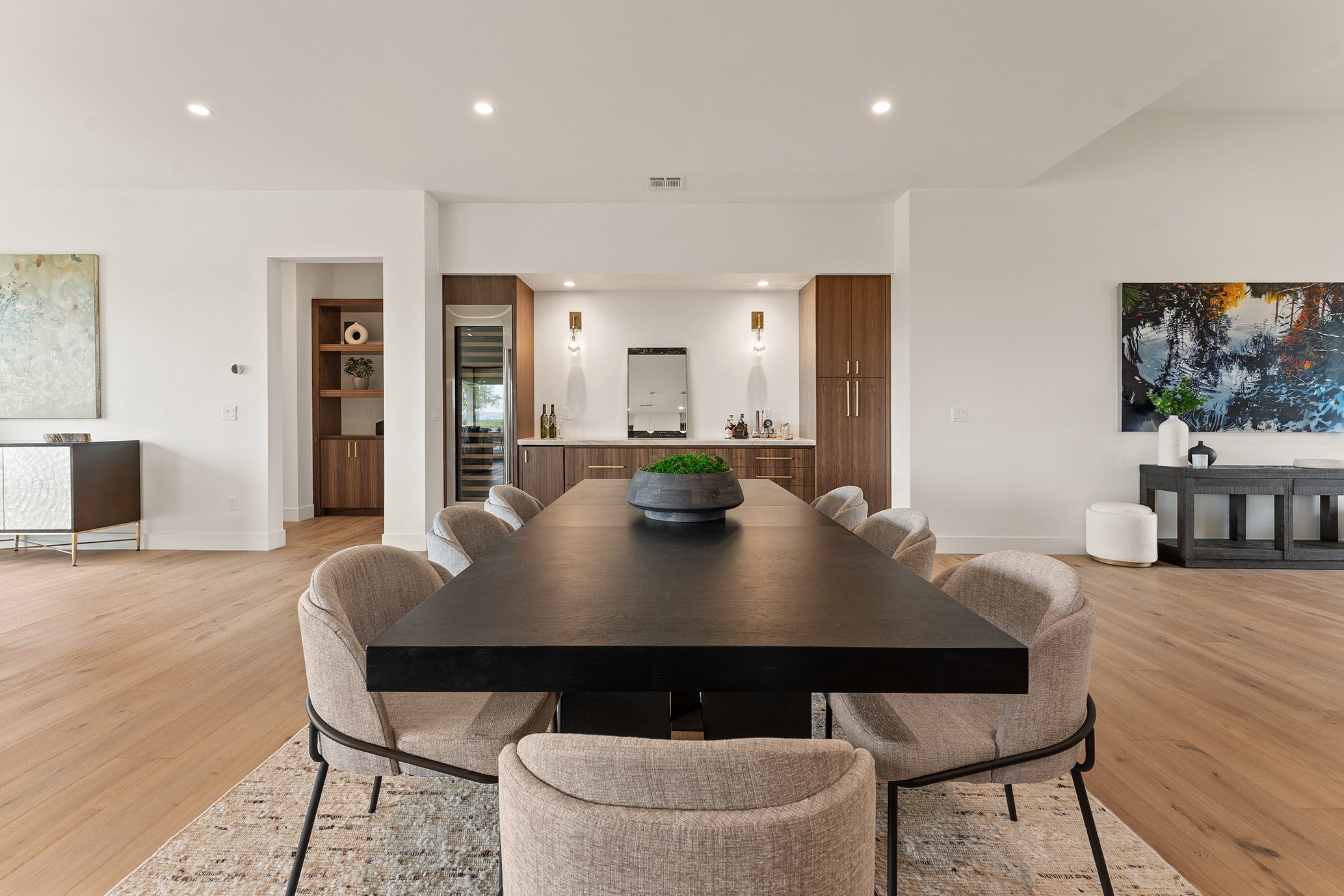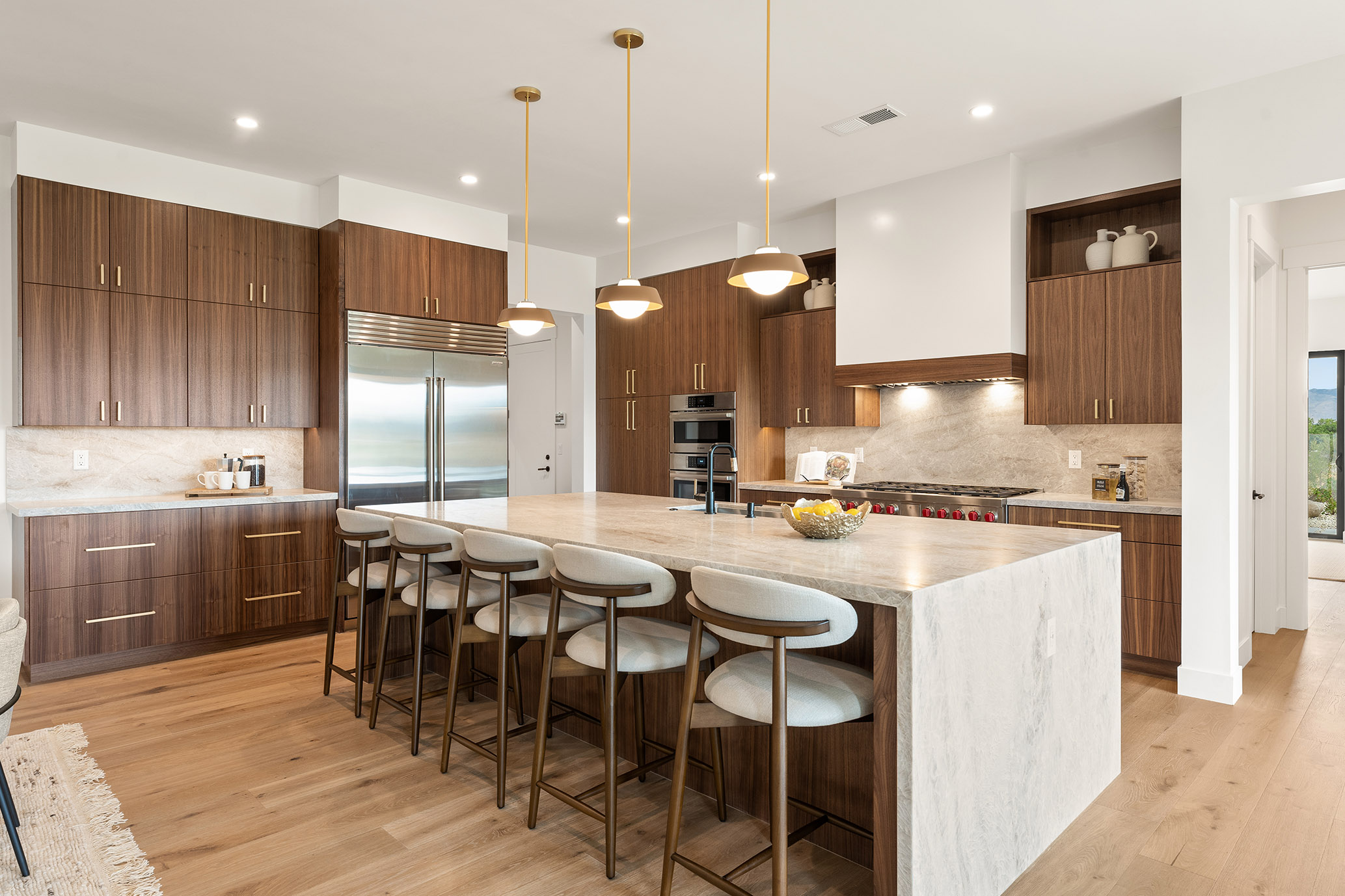 The home is centered around the open living and kitchen area – this is a setting for entertaining on a grand scale – three sets of sliding glass doors open to a large patio for seamless indoor-outdoor flow.