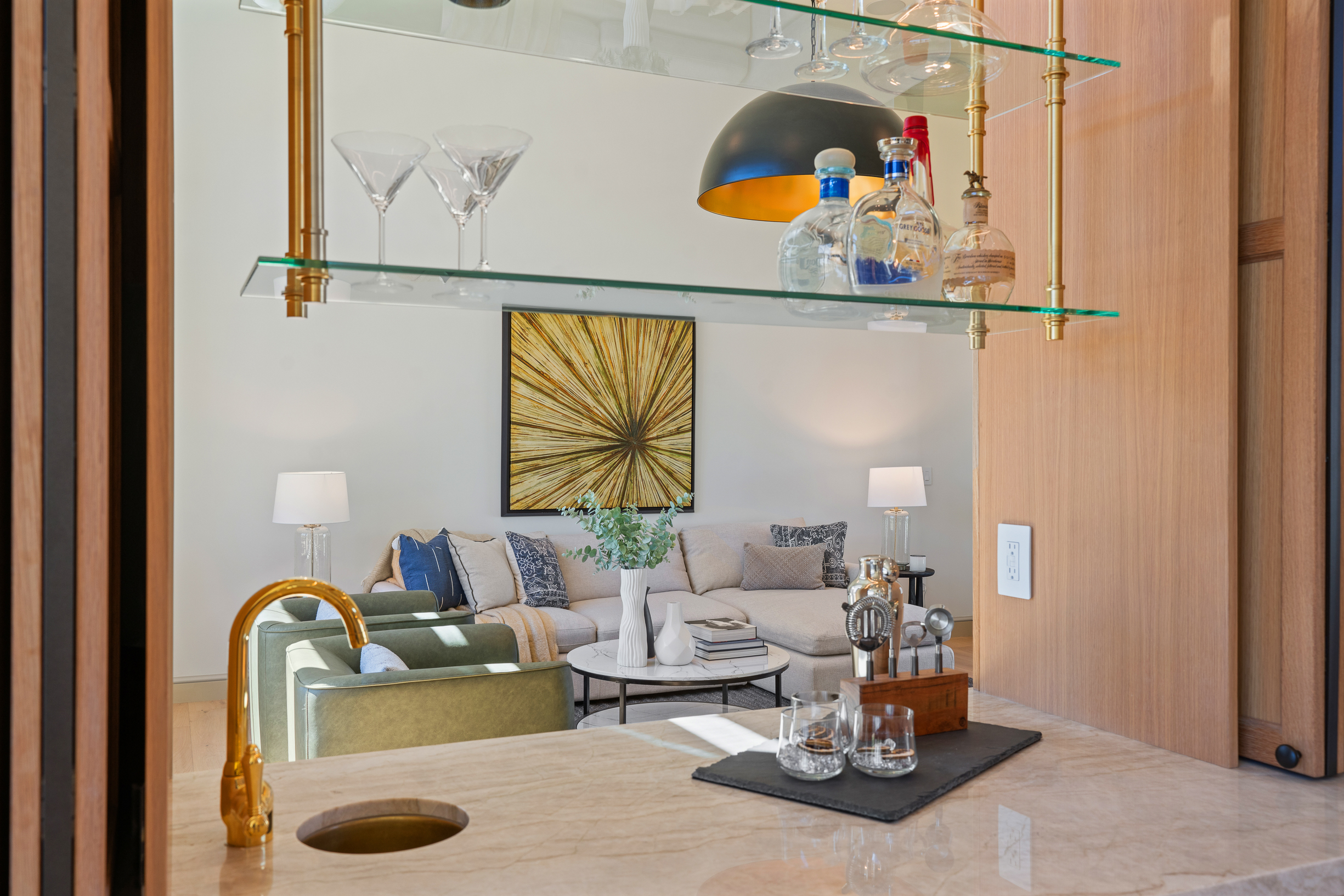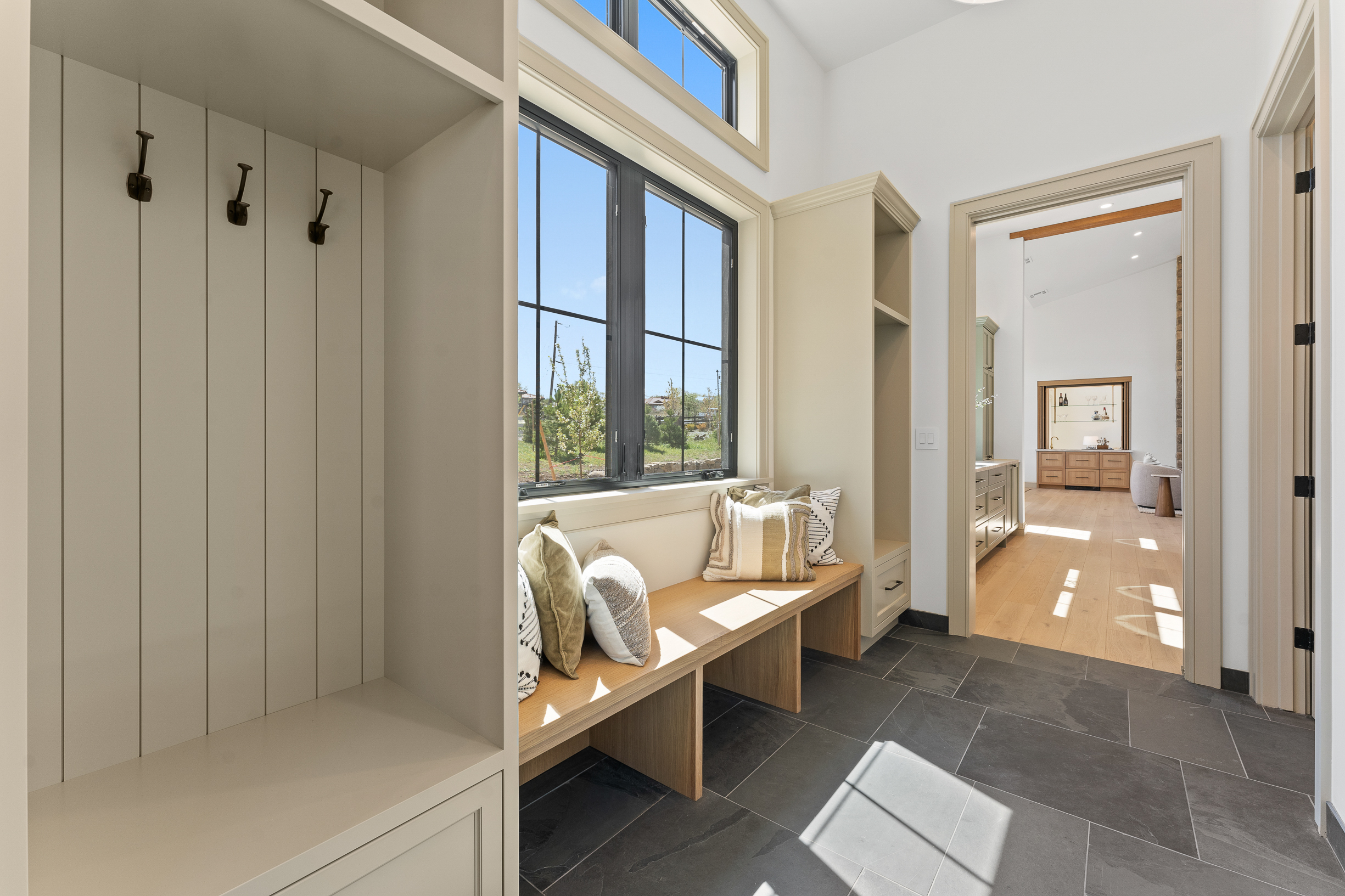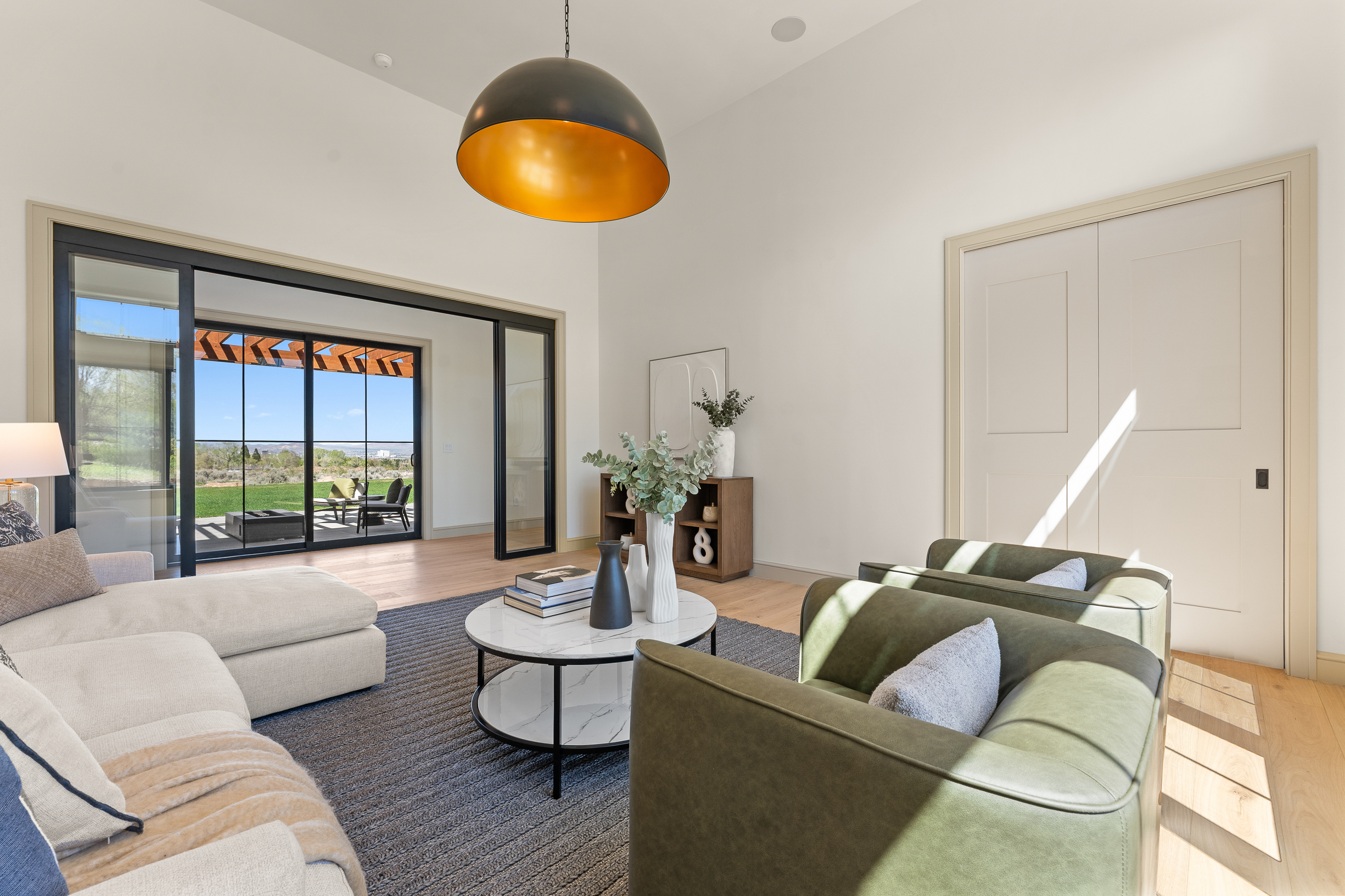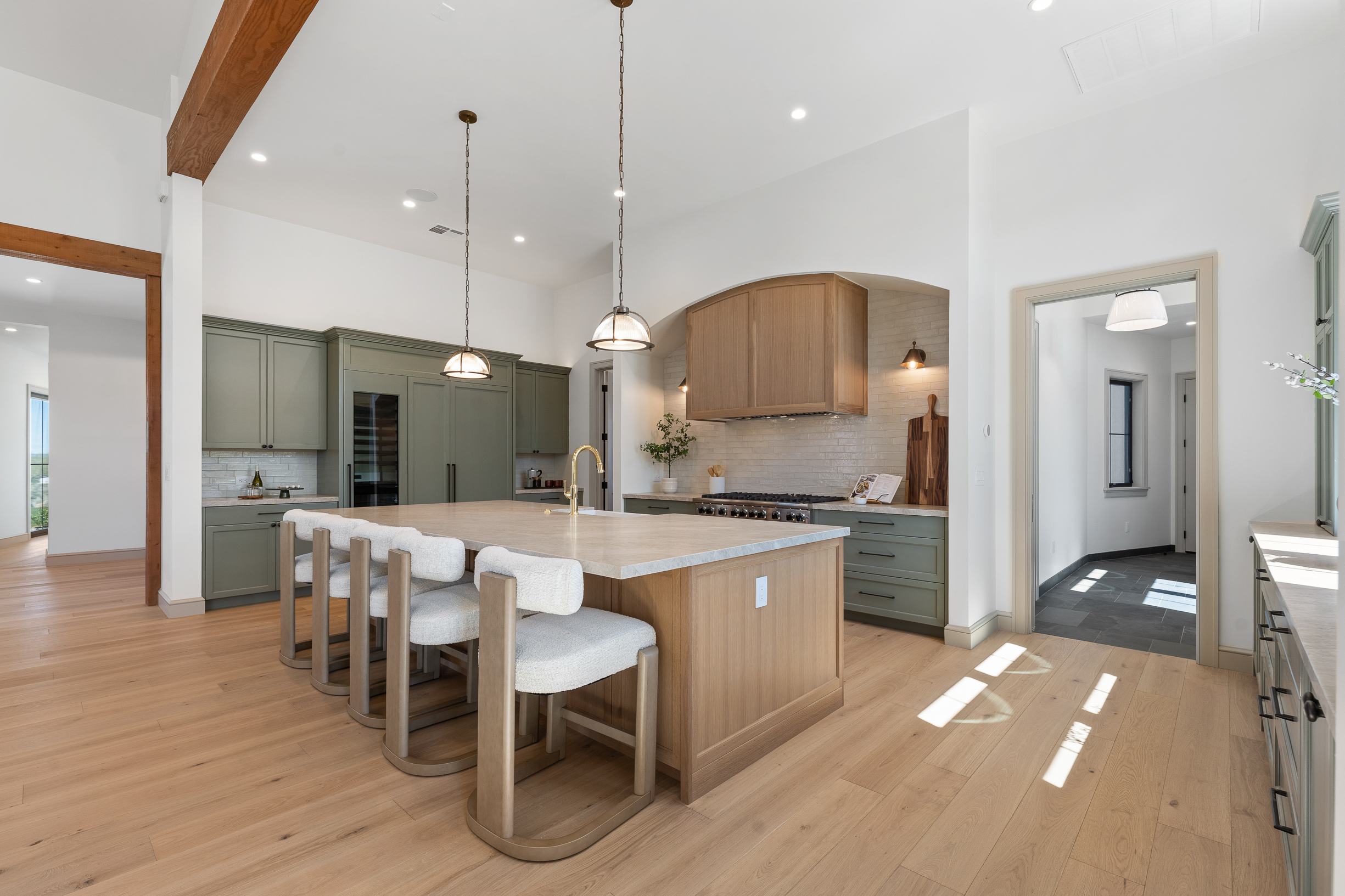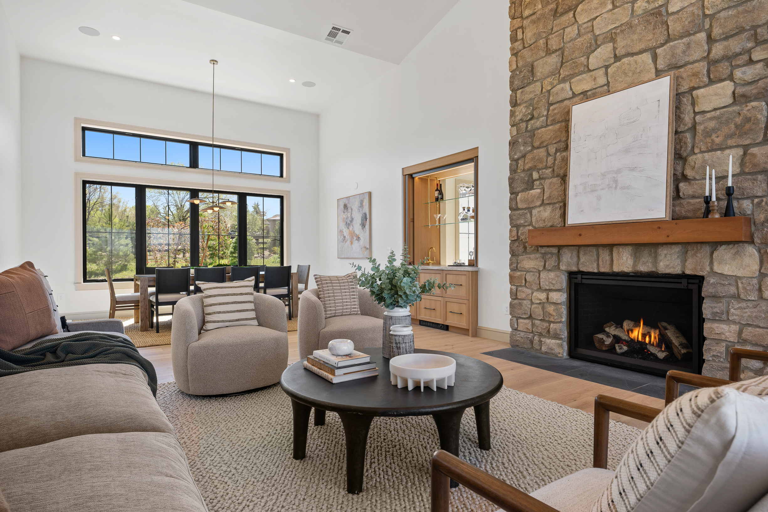 Spanning 4,859 sqft, the home balances style and functionality with 4 bedrooms, a dedicated office, and 4.5 baths. Each bedroom is ensuite, offering comfort and privacy, while a winged layout and split garage configuration lend themselves to seamless multigenerational living. Soaring ceilings and expansive glazing fill the interiors with natural light, while sculptural wood beams, natural stone, and white oak flooring create a warm, organic palette that quietly reflects the surrounding landscape. The voluminous Great Room, defined by 17-foot ceilings, a dramatic ridge beam, and a large stone fireplace, flows effortlessly into a chef’s kitchen. Custom cabinetry, an oversized island, top-tier appliances, and an adjacent butler’s pantry with additional ovens, dishwasher, and storage create an ideal setting for entertaining. Near the dining area, a custom peekaboo bar subtly connects to the adjacent media room, adding both function and a touch of whimsy. The glass-enclosed Media Room is a striking and versatile space with captivating views of the city lights. Sliding glass doors open to a large pergola-covered patio graced with sweeping vistas. A gas fire table anchors the lounge, while the adjacent dining area is well suited for both intimate evenings and larger gatherings.